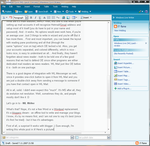 You know how many buttons I had to press? alt+PrtScr followed by Ctrl+V. Yup, you get it. It made a thumbnail, linked to original, and once I'm done it should be on web without much hassle. I'll leave this picture as it is, but as you can see on the first one (WL Mail) it supports text wrapping, and you can link/unlink original (I've removed original in WL Mail so you can't see much of my details.. hopefully ;) ), resize both thumbnail and/or original, adjust margins, add and change borders, rotate, adjust contrast, ad watermarks of your choice and several standard effects like B&W, Sepia, Gaussian blur etc. Of course, you can attach and modify any image as you wish.